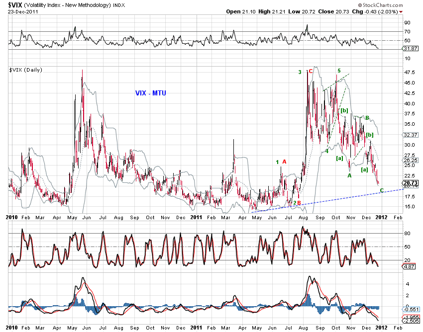 VIX appears to be approaching the end of a double zigzag decline (Chart 3).